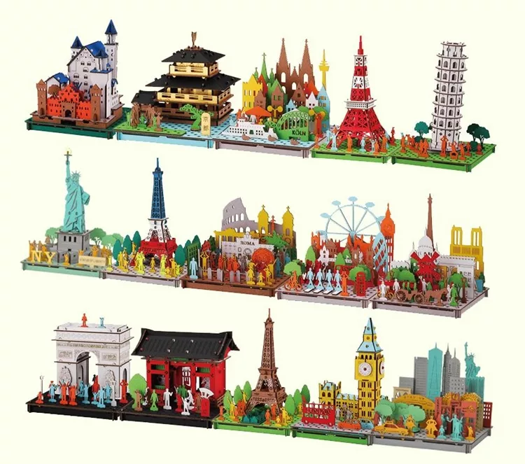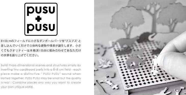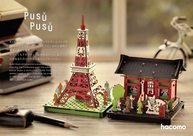 日本手作紙模型品牌HACOMO,透過簡單環保的紙製品拼圖激發大朋友小朋友創意,其中PUSUPUSU系列為在小小瓦楞板上拼出桌上景點立體模型,紙版拼圖品質良好,不易凹損,十字小孔可自由改變小人的位置,讓你在桌上就能環遊世界。